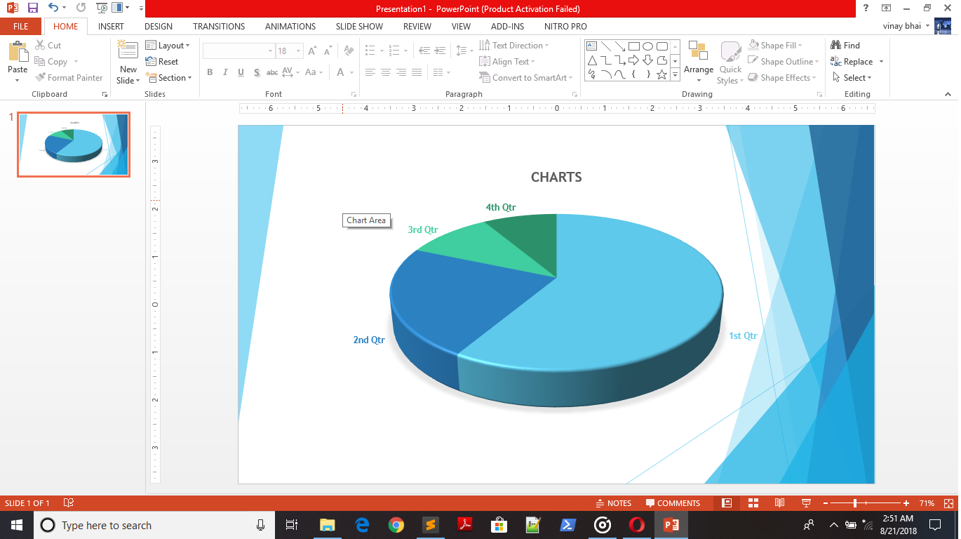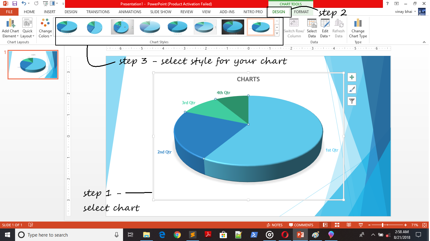 You can change or customize the chart color, chart layout, chart type etc. just by clicking on command under Design tab to give a better appearance to your presentation.
