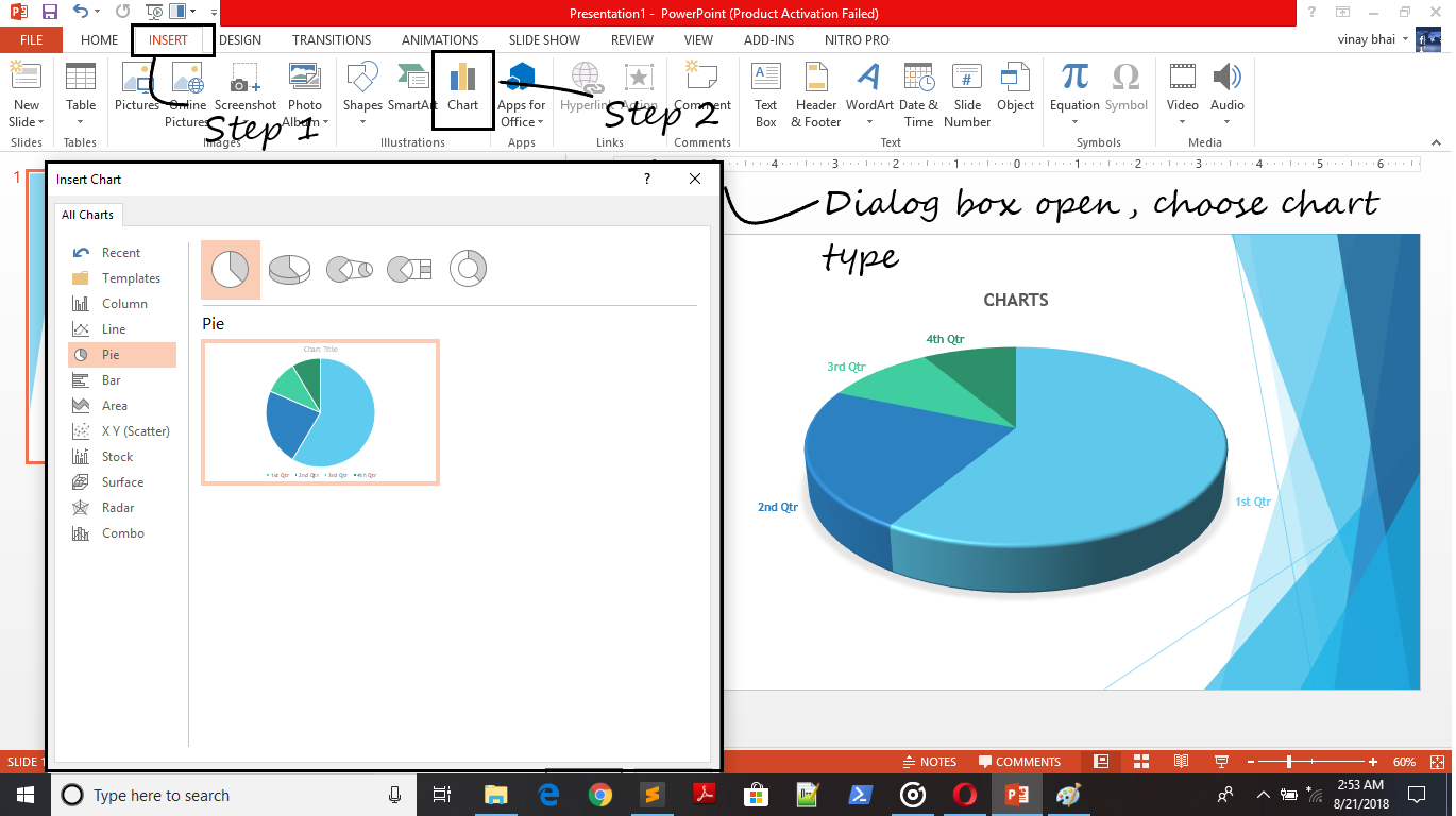 Perform the following steps to insert a charts in slides –
