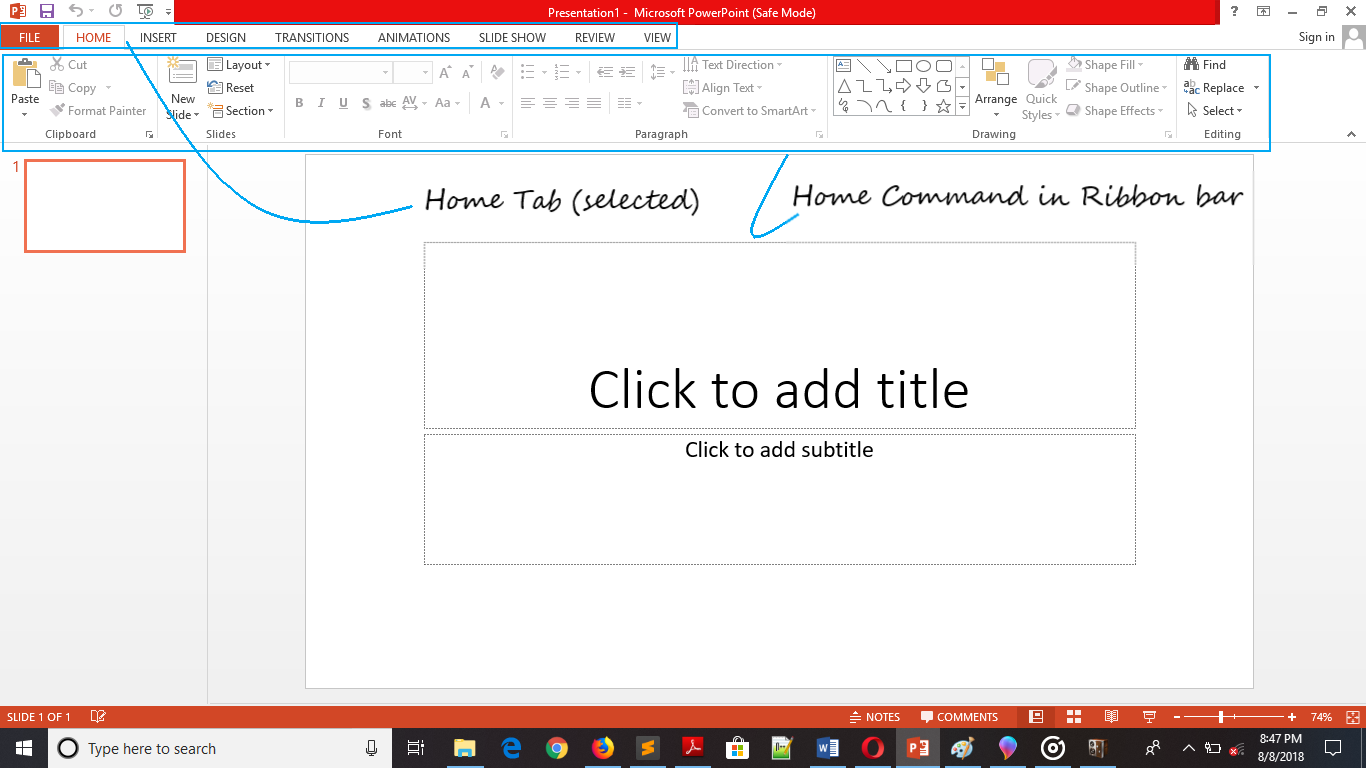 By default, whenever you open a PowerPoint, Home tab is selected and gives you access to its commands. You often need to move between tabs while you are creating or editing your presentation.