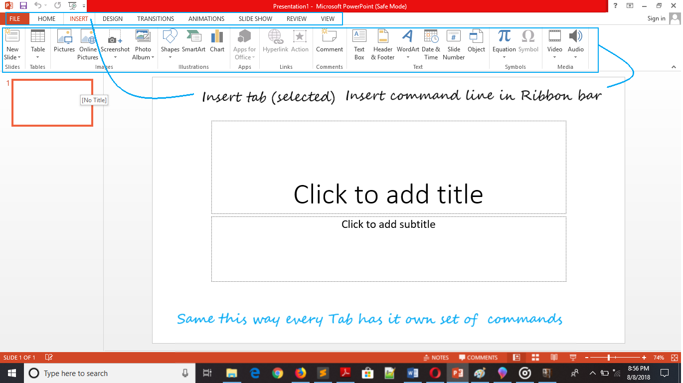 Ribbon is a tab system instead of menu bar. It contain multiple tab and each one contained group of several command used to create an effective presentation.