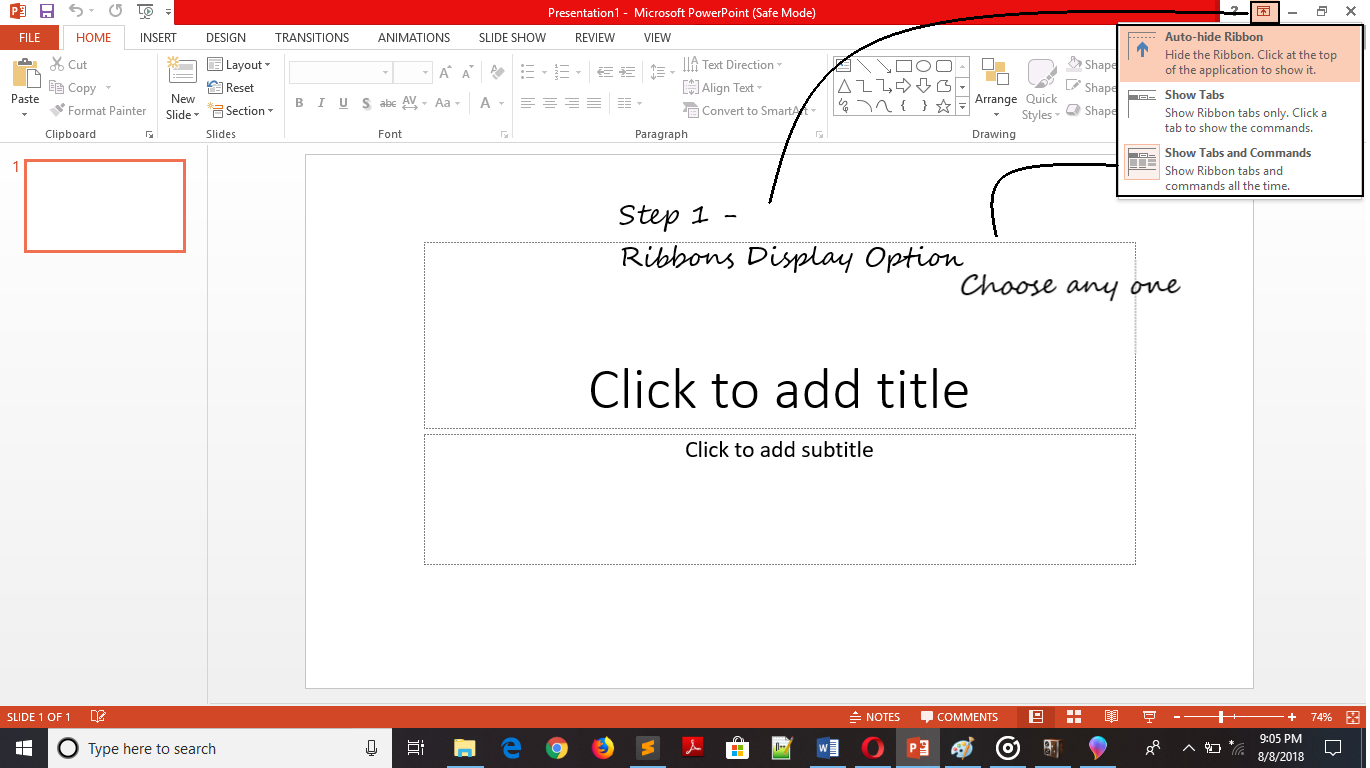Now if you thinking that default way of ribbons and commands is best, then go to Ribbon Display Option and click on Show Tabs and Command option. Ribbon will again come in original or default manner.
