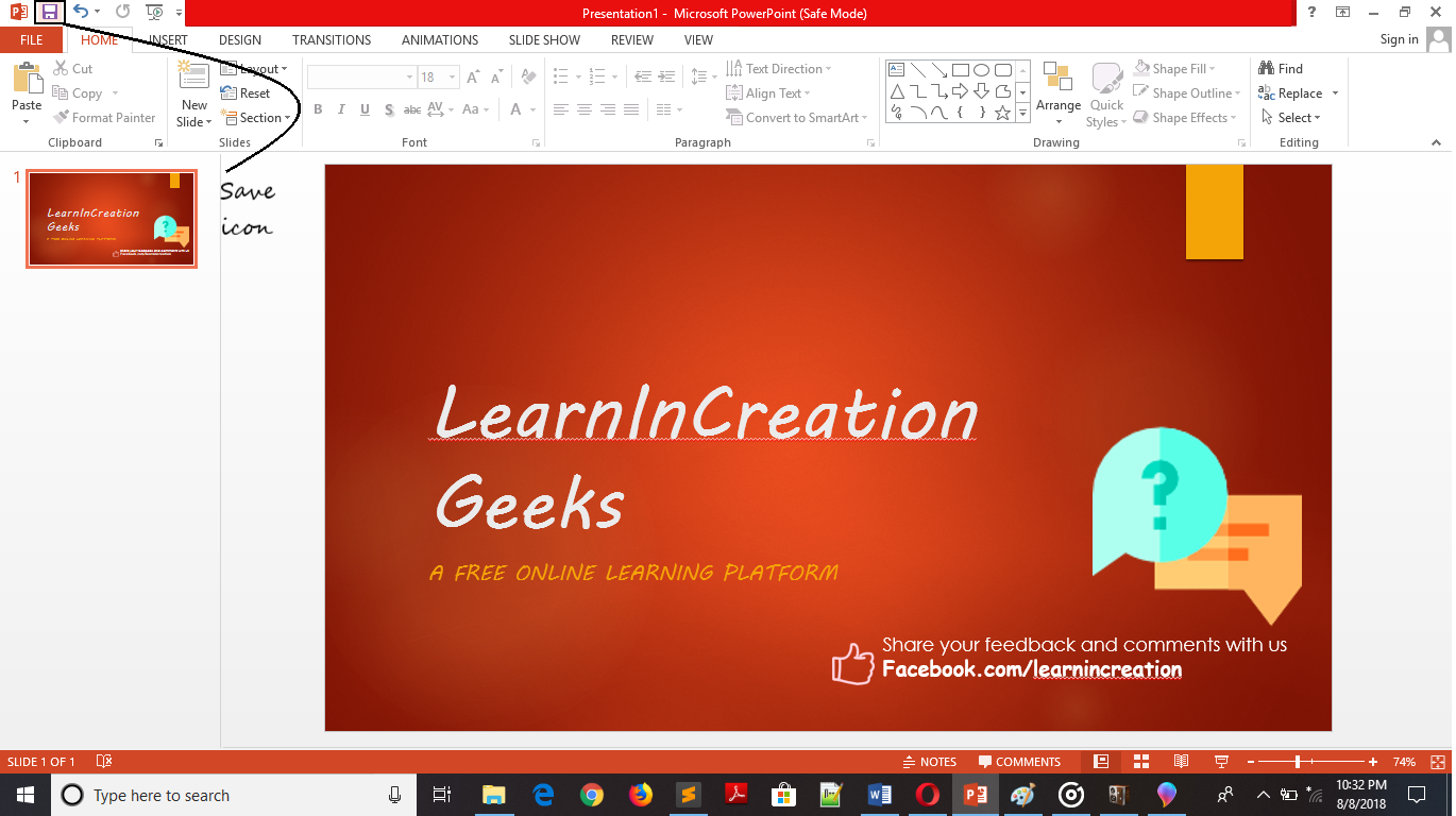 Second method to save your presentation is simple than first one. To save you presentation simply press Ctrl + S and a new window of Save As will open to enter file name and to choose location. Input the required field and your file is save, and you are free to go for a short break.