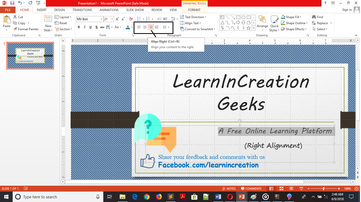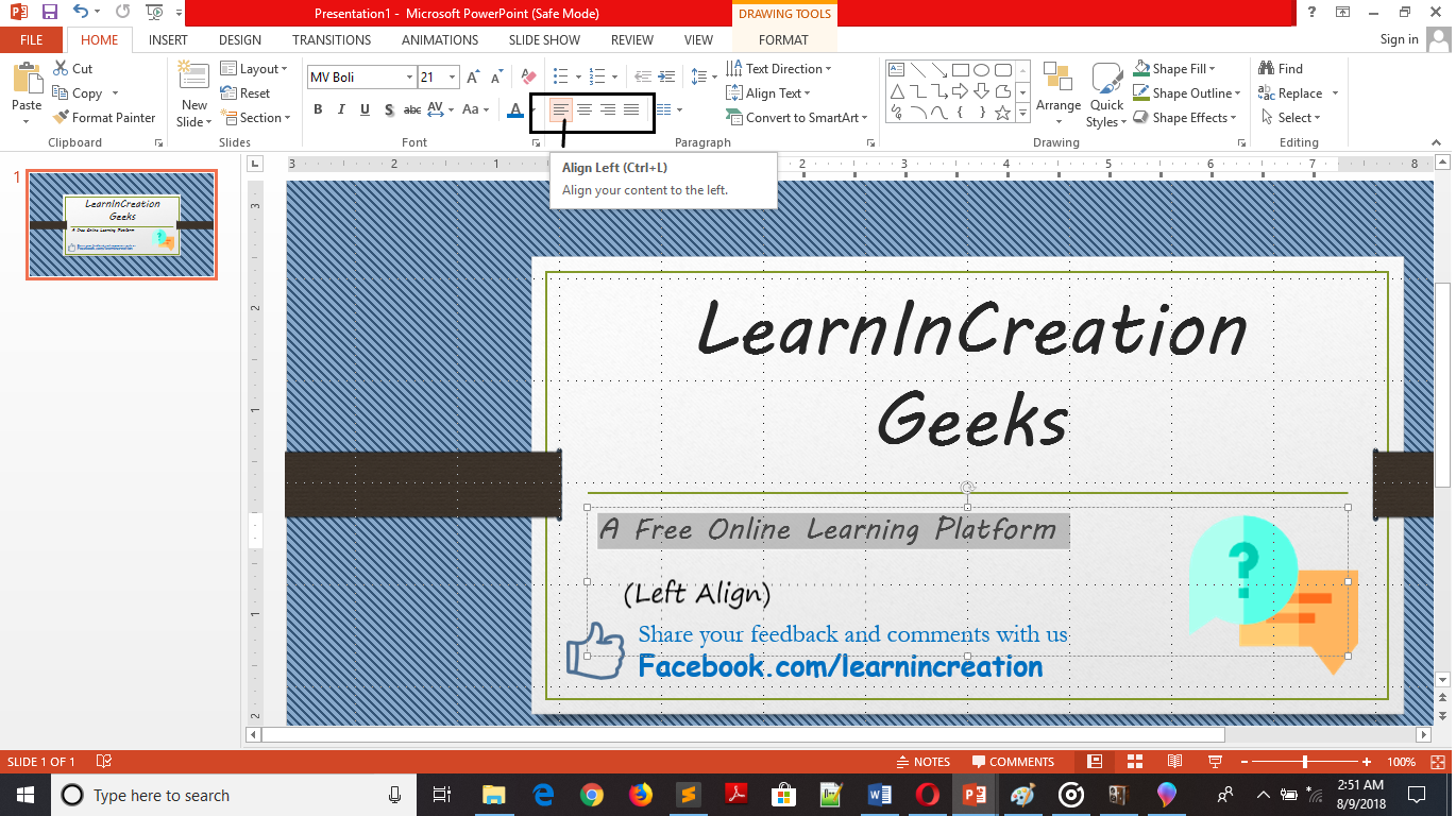 Alignment of text to its right position or according to slide layout gives a beautiful look to presentation. Well, you can align your text to –