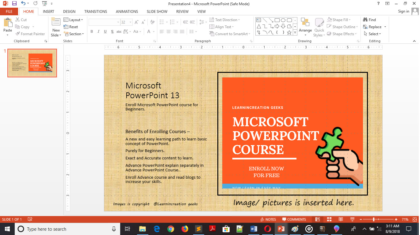 Now, you learn what an importance of picture while you are deliver a message to an audience. So next step is to insert pictures in your presentation. Follow these simple steps to insert an images in your presentation –