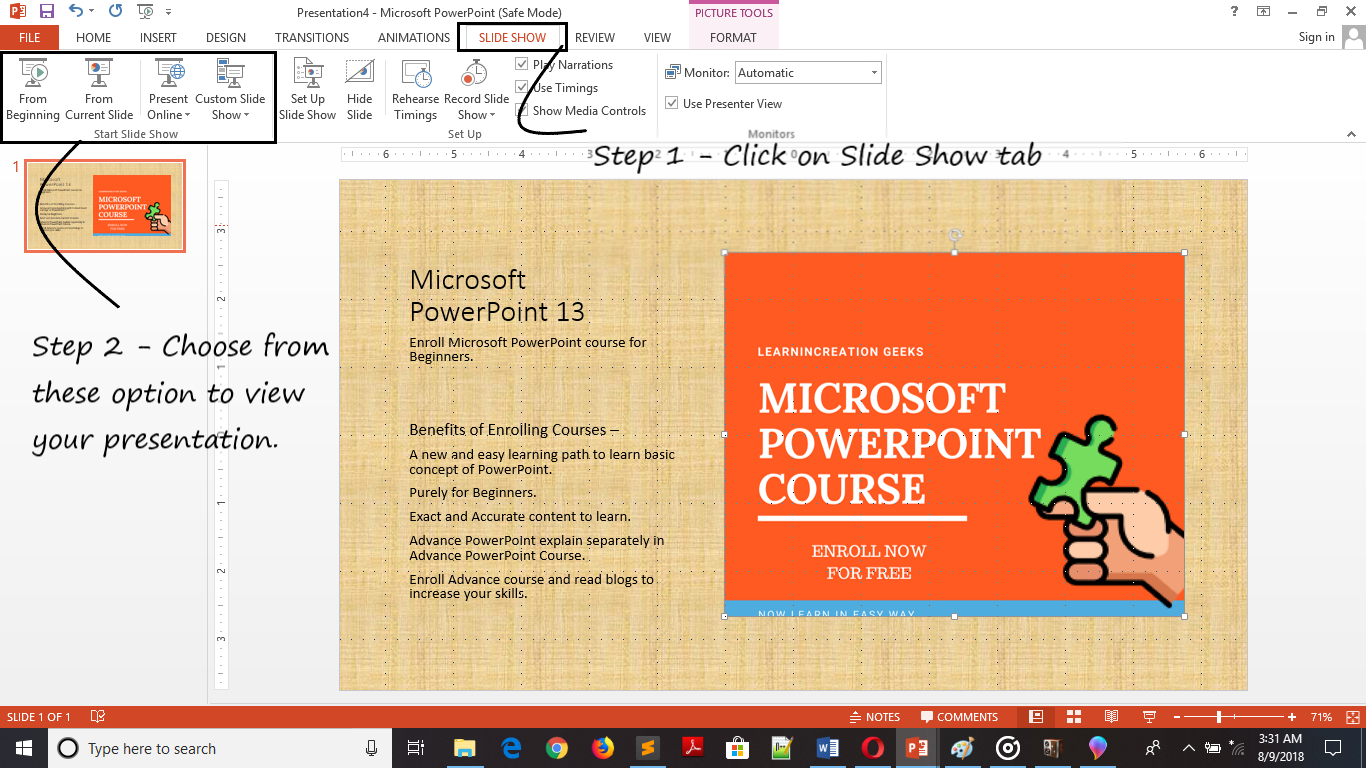 You learnt to insert slide, formatting text, you also already learn about slide layout, theme, template, pictures and image formatting. So it’s a time to view the presentation you made.